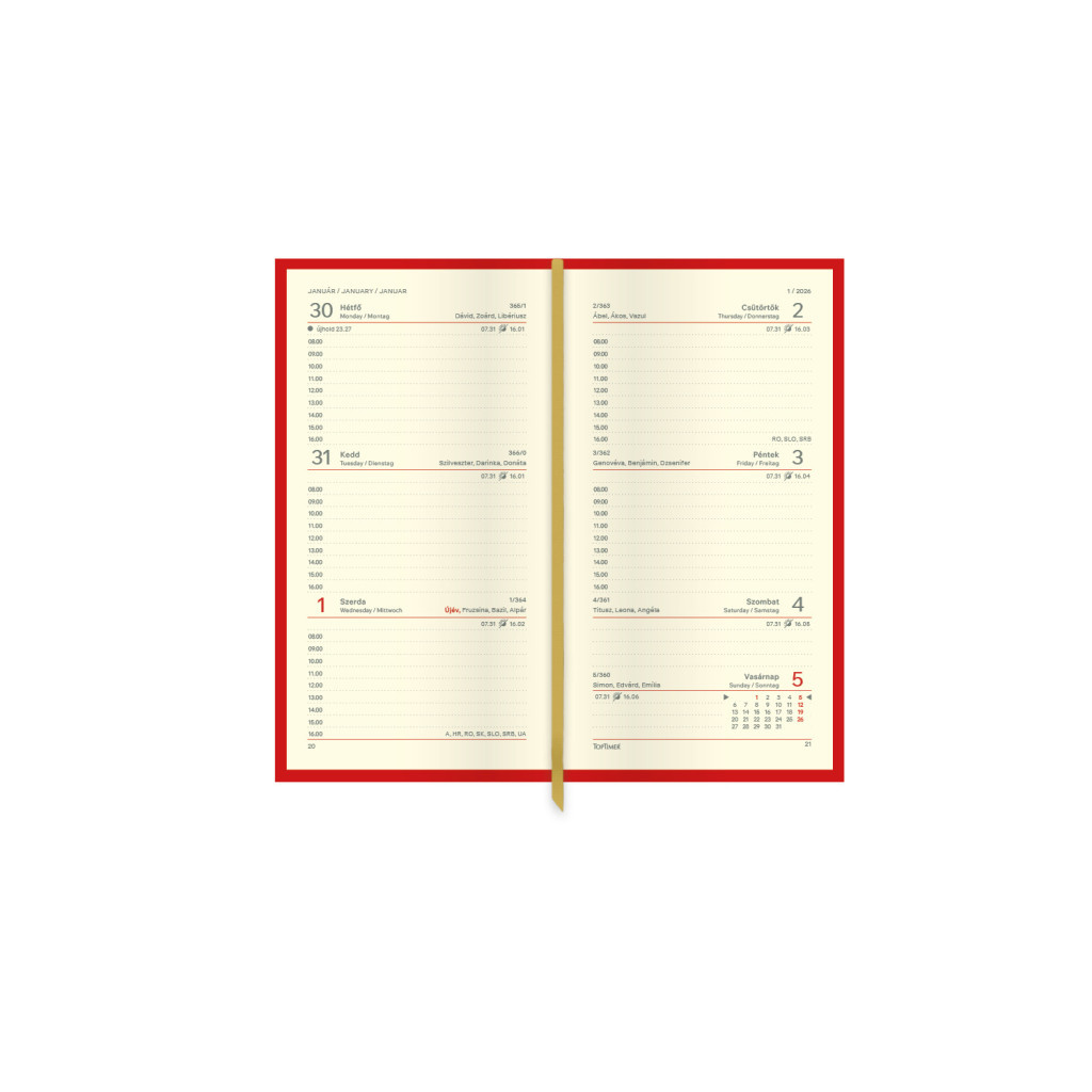 A Duplex prémium minőségű zsebnaptár nem csupán praktikus, de stílusos is, matt, hőre színeződő műbőr borítójával és elegáns keresztirányú varrásával. Az ezüst présfóliával nyomtatott évszám exkluzív megjelenést kölcsönöz a naptárnak, kiemelve kifinomultságát.