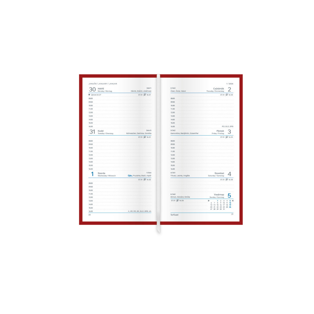 A fehér papírblokk heti beosztással készült, így egy oldalpár egy hét napjait foglalja magában. A színes oromszegő, a jelzőszalag és a sarokperforáció segíti a könnyű használatot és navigációt.