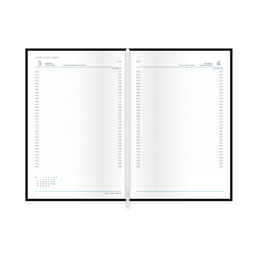 A Traditional B5 napi beosztású határidőnapló a klasszikus elegancia megtestesítője. A holland fényes műbőr borítás időtlen eleganciát sugároz, miközben a praktikus belső oldalak segítenek Önnek a szervezett munkában.