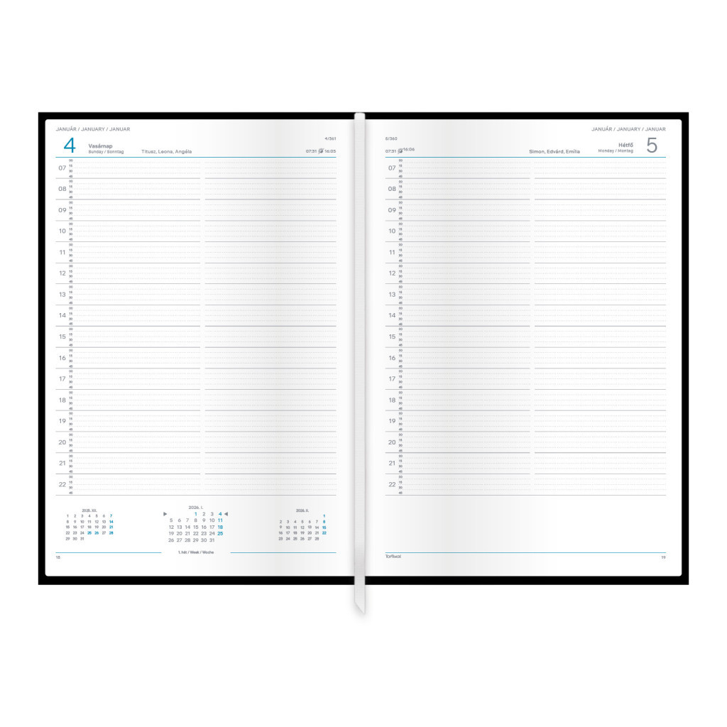 A Wide A4 napi beosztású határidőnaplót alakítottuk ki, hogy a napi több bejegyzés se okozzon gondot. A matt műbőr borítás elegáns megjelenést kölcsönöz, miközben a praktikus belső oldalak bőséges helyet biztosítanak minden tennivalójának és jegyzetének, segítve Önt a tökéletesen szervezett munkában.